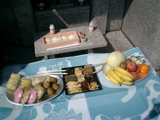 お墓参り(清明祭という)には行事料理の他、果物やお菓子お酒などをご先祖様に供えます。
